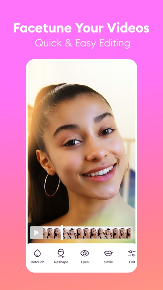 Facetune Video Editor Retouch your selfie videos in a few taps Discover the endless ways you can elevate the look and style of your videos. Start free trial 7 day free trial, cancel anytime Lights, camera… stunning skin Smooth/Smoother Give your skin an even look and control exactly how smooth you go. Glow No sun? No problem. Get perfect portraits with our full-featured face editor 01. Remove Blemishes Use Blemish Fix to erase imperfections. 02. Make Skin Radiant Use the Perfect Skin Tool to blend skin tone and texture. 03. Whiten Teeth Make your pearly whites look their best with Teeth Whiten. 04. Enhance Features