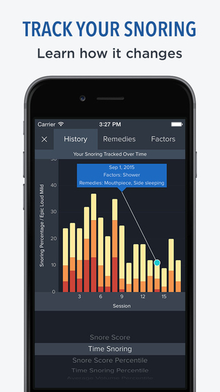 The most popular and innovative app of its kind, SnoreLab records, measures and tracks your snoring and helps you to discover effective ways to reduce it. SnoreLab has monitored more than 50 million nights of sleep and has helped millions of people to better understand or even eliminate their snoring problem. The Snore Control app is available on the App Store and is thus available only to iPhone users for downloading and usage. This app works by recording your snoring sound and helps you further analyze and treat the problem. Features The data and history are well managed and arranged in the app.
